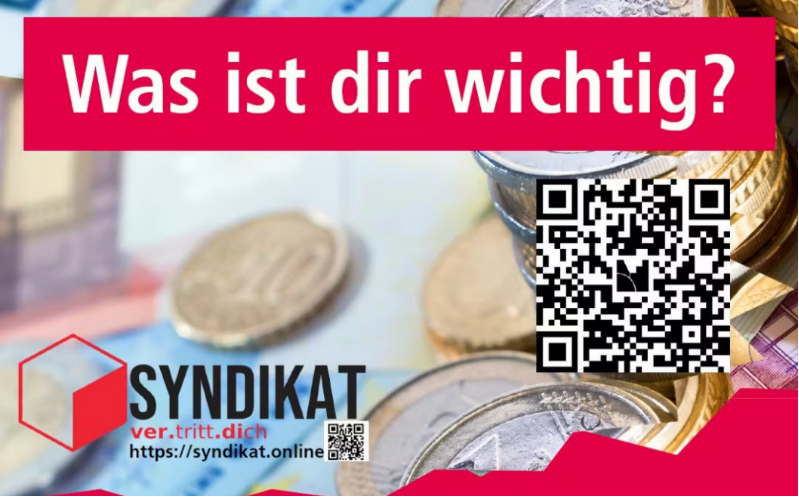 Genau dazu haben wir die Gewerkschaft SYNDIKAT gegründet. Die Verhandlungen werden in dieser Entgeltrunde noch einmal durch den GBR geführt. SYNDIKAT wird die Verhandlungen in enger Abstimmung mit dem GBR unterstützen. Am Anfang einer Entgeltrunde steht die Forderungsdiskussion und hier bist Du gefragt. Beteilige Dich und sprich auch Deine Kolleg*innen an! Ergebnisse von SYNDIKAT – Mitgliedern sind uns besonders wichtig: Wir werden diese separat auswerten!